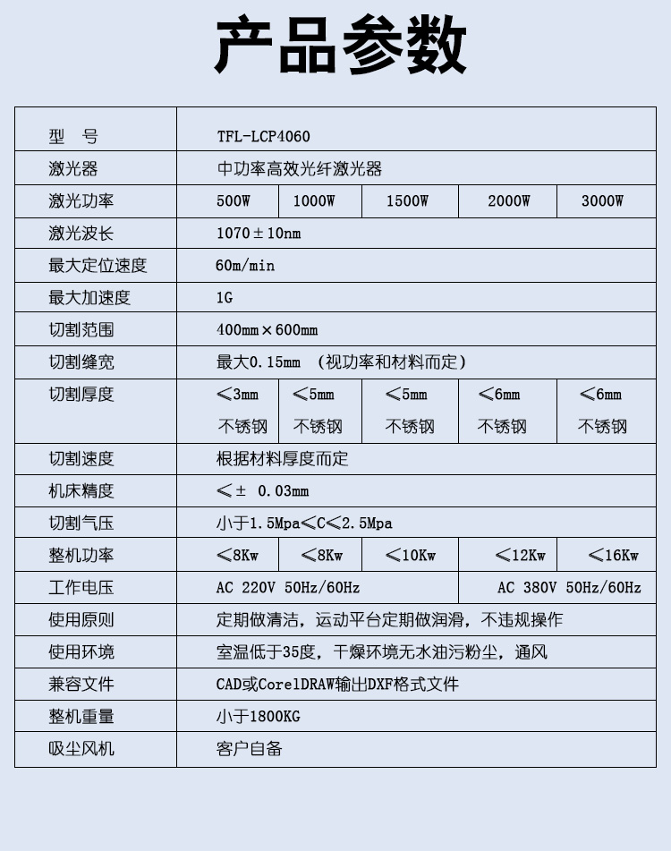 激光功率 500W 1000W 1500W 2000W 3000W